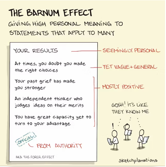 Think about it. It seems like Myers-Briggs appeals to the same people that astrology does. It has a similar number of categories that people are grouped into, with descriptions that leverage the Barnum Effect with vague flatteries.